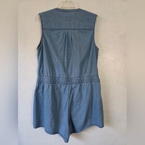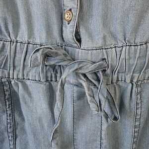 Stylish denim jumpsuit by Torrid. Features button front and drawstring waist. Sleeveless design with chest pockets.