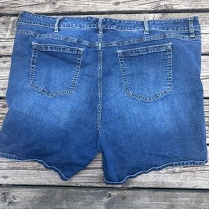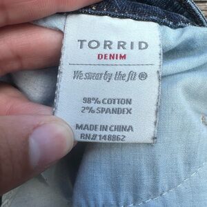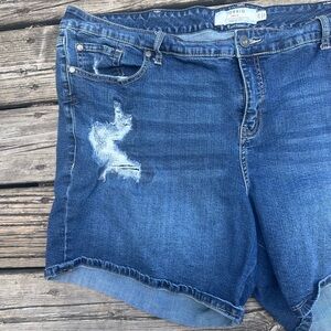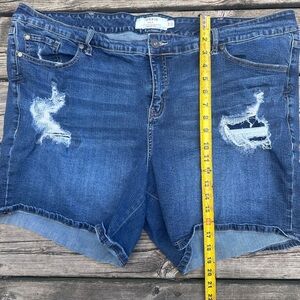 These Torrid jean shorts in a classic blue hue feature a trendy distressed design with frayed hems and a mid-thigh cut, perfect for a casual, laid-back look.