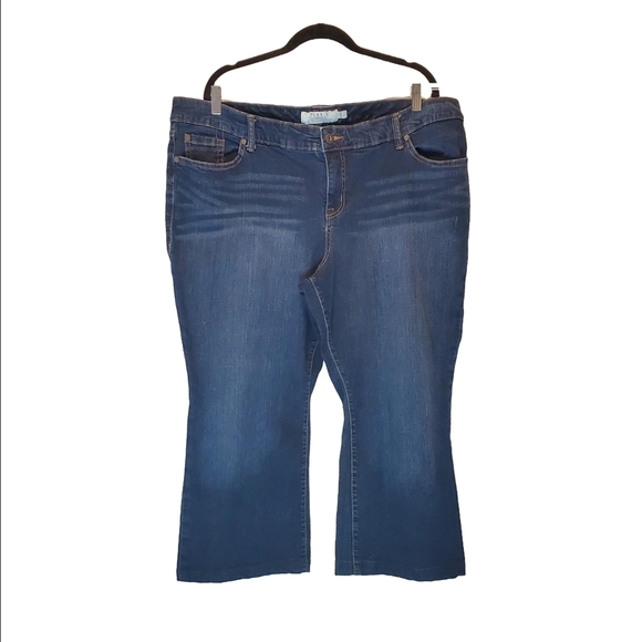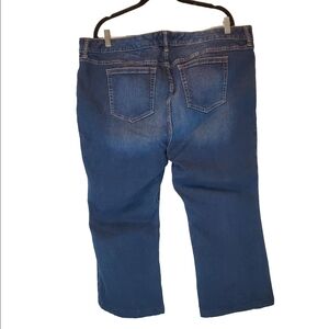 These Torrid jeans feature a classic blue wash with a stylish flare. The cropped cut and subtle fading on the thighs offer a comfortable and chic look for any casual outing. These jeans are a size 22S. The fabric is stretchy. They length has been altered to make them Cropped. The inseam is approximately 23 inches. From a smoke free home.