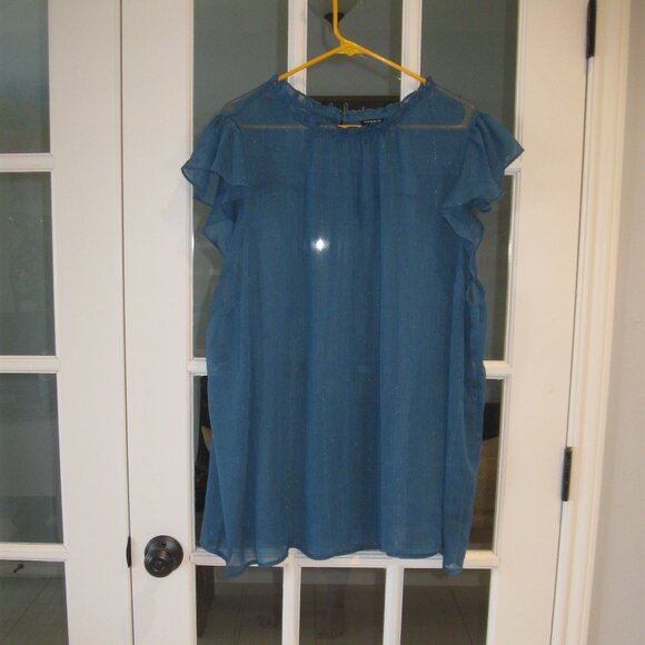 This lovely blue top by Torrid features a round neckline, flutter cap sleeves, and a relaxed style with ruffled details. Perfect for adding a touch of femininity to your wardrobe. Never been worn, so new without tags. I took the tags off thinking I was going to wear it and I did not. It is sheer so you will want to wear a spaghetti strap shirt under it.
