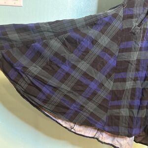 This Torrid trench coat is a classic and preppy addition to your wardrobe. The blue and green plaid pattern is perfect for the fall, winter, and spring seasons. The coat is made of rayon material and features a button closure, with accents that match the closure. It is a size large and has a regular fit.