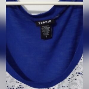 This Torrid blouse showcases a stunning blue hue with delicate lace detailing, offering a fitted silhouette and short sleeves. The intricate lace design adds elegance, making it a versatile piece for both casual and formal occasions.