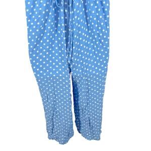 Chic and versatile, this Torrid wide-leg jumpsuit in light blue with white polka dots is a must-have for easy, stylish outfits. The sleeveless design flows into a relaxed wide-leg silhouette that flatters curves and moves effortlessly. Adjustable open back with a back-tie closure gives a custom fit and adds a playful touch. Crafted from soft rayon stretch crepe, and in excellent pre-owned condition from a smoke-free home. Machine washable for easy care. The flat-lay measurements approximate: waist 16”, rise 10”, inseam 27”, total length 53” when adjusted. Whether you pair it with sandals for casual days or heels for a dressed-up look — this one-piece delivers comfort and timeless polka-dot charm.