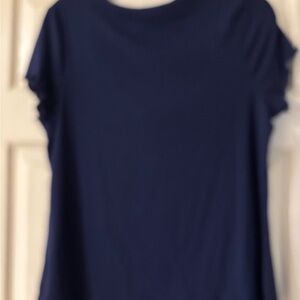 This blue t-shirt from Torrid features a ribbed texture and ruffled short sleeves, offering a stylish twist on a classic tee. Made from a soft, stretchy material, it provides a comfortable fit perfect for casual wear. The scoop neckline adds a touch of elegance to this versatile wardrobe staple.