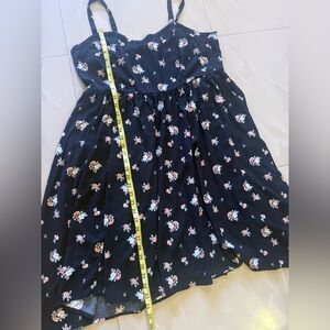 This Torrid camisole dress features a whimsical starry pattern on a rich blue fabric, perfect for casual summer outings. The lightweight material and flowy design offer comfort and style, making it an ideal choice for warm weather. Its fitted bodice and flared hem create a flattering silhouette. Torrid brand dress in a women's size 2. The dress has thin straps, a sweetheart neckline, and an empire waist. It features a black background with a pattern of small, multi-colored flowers. The skirt of the dress is asymmetrical, with a handkerchief hemline. The dress appears to be made of a lightweight, flowing fabric, suitable for warm weather.