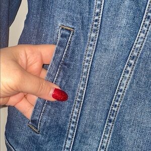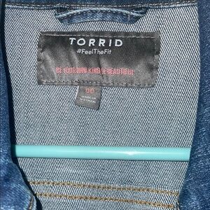 This Torrid jean jacket in a classic blue hue is a timeless addition to your wardrobe. Its trucker-style design and regular fit offer a comfortable and stylish look for any casual occasion. The medium blue denim wash with slight fading adds a touch of vintage charm.