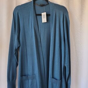 Stay cozy and stylish with this elegant blue cardigan sweater. Perfect for layering, it features a sleek design and comfortable fit. Ideal for any occasion. Has 2 front slip pockets is NWT.