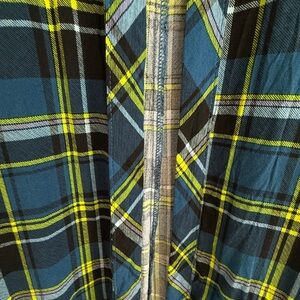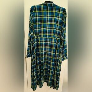 Chic plaid long lightweight duster by Torrid. Features blue, white, and black with yellow stripes. Ideal for casual outings, trips to the pumpkin patch, or staying cute by the bonfire. Size 6 but I gently wore this at a size 5. Smoke and cat free home.