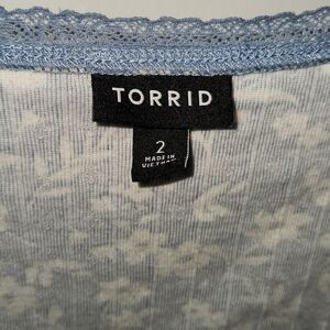 Elegant blue blouse with white floral design. Features short sleeves. Perfect for casual outings.