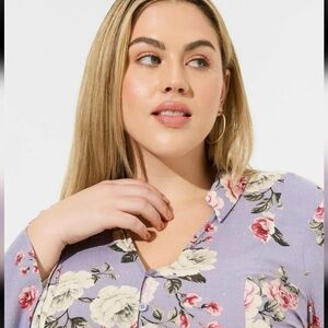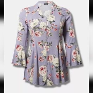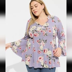 Torrid Blue-Lavender Floral Blouse with Bell Sleeves and Ruffled Style 2x