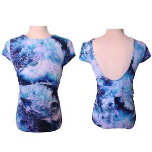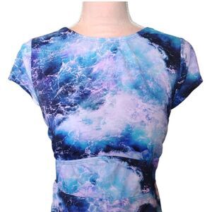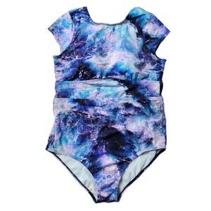 Tie dye in white with blues, purple, black & teal colors. One full piece, with High neck & cap sleeves. Slim Fix mesh lining, with extra slimming tummy control. Lightly lined. Wireless cups. Full coverage. Scoop back feature; easy pull on.
