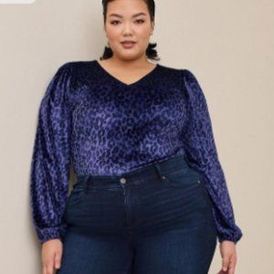 This is a long sleeved bodysuit from Torrid. Stretchy, soft velvet / velour texture fabric. Long blousson style sleeves. V-neckline. Blue leopard animal print. Snap close at crotch.