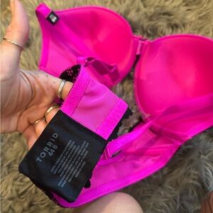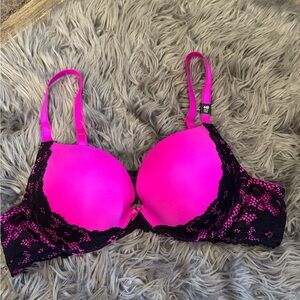 Experience comfort and style with this elegant pink and black lace bra. Perfect for everyday wear, it combines a vibrant pink hue with classic black lace detailing.