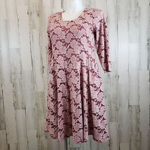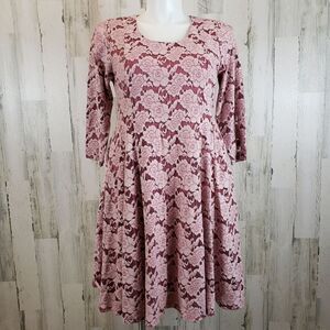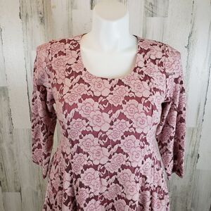 ~ Description: Dusty rose and mauve brushed lace skater dress, sheer lace with lining underneath, 3/4 sleeves, scoop neck, stretchy