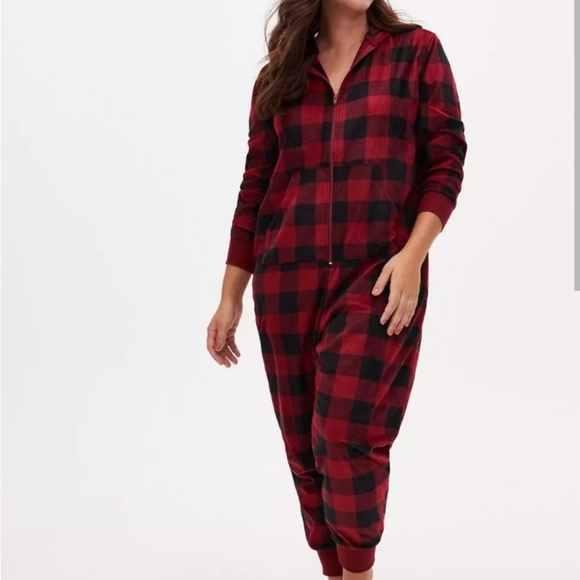 Torrid Buffalo Plaid Fleece Hooded Lounge One Piece Back Flap Size 0/00 (M/L)
