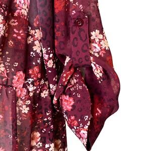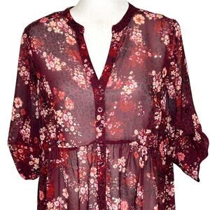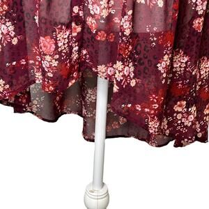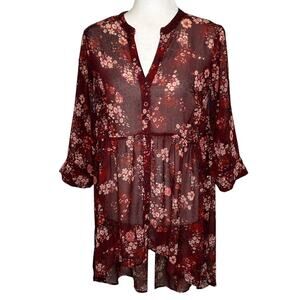 Torrid Burgundy Floral Chiffon Hi-Low V-Neck Roll Tab Sleeve Tunic Top Blouse. Button up front, Sheer. Size 00 or Medium/Large or 10. Measurements taken flat: