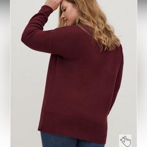 Torrid Burgundy Maroon Silver Sequin Moon Mock Neck Sweater. Model is wearing a size 1. Dropped shoulder. Sequin detail. Moon and stars graphic. Ultra Soft knit fabric: A yarn that is so soft and so cozy, you'll never want to take it off! Maximum stretch level. Size 1 (1XL)