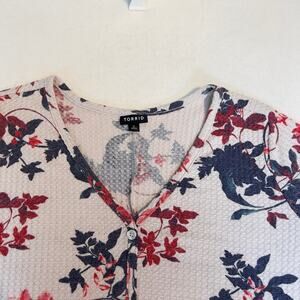 Torrid Button Shirt Woman Torrid Size 2 V-Neck White w/ Red & Blue Floral Stretchy Cottage