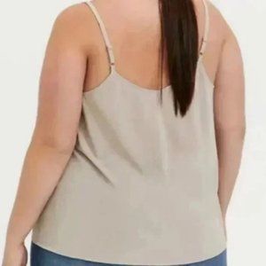 Torrid taupe and black lace button cami. Challis fabric. V-neck. Lace trim. Faux button front. Sleeveless, adjustable spaghetti straps.