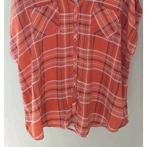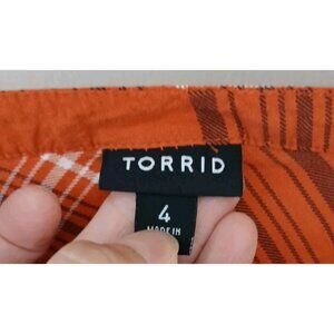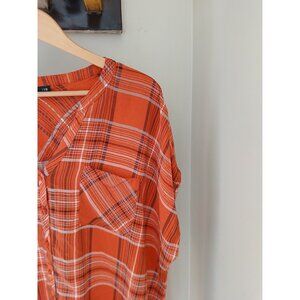 Torrid Challis Button Up Short Sleeve Blouae. Plus Size 4 4X 26. Orange plaid. Western, fall, casual, peasant, boho. In nice, preowned condition. In nice, preowned condition. Measures approximately 28" pit to pit, 29" shoulder to hem.