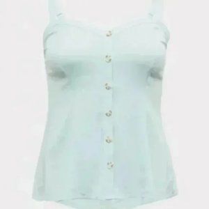 Torrid mint blue challis fit and flare midi cami. Stretch Challis fabric. V-neck. Non-functional button front. Sleeveless. Adjustable straps. Princess seams. Hi-lo hem. Midi length.