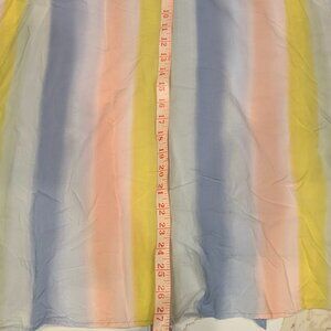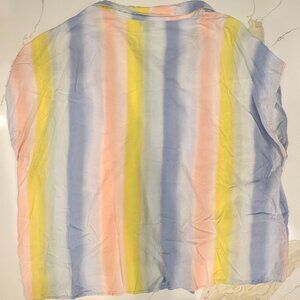 Torrid women's rainbow stripe challis tie front dolman blouse in size 3, equivalent to a 3X. Collared with cap sleeves and buttons. Blue white yellow pink strips for rainbow pastel. Tie front and can be worn cropped or full length. Lightweight rayon. Smoke free, dog friendly home. Great used condition.