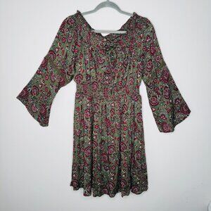 Torrid Challis Skater Dress Womens 0X Green Paisley Floral Long Bell Sleeve Off the Shoulder Lace Detail Elastic Lace Up Collar Fully Lined 11165766. Measurements available upon request.