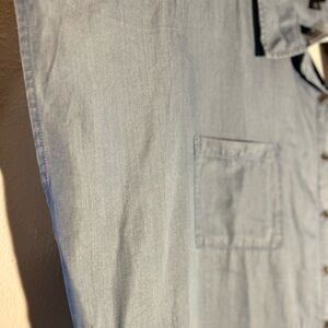 This is a Torrid chambray blouse in size 4XL for women, featuring a collared neckline, cap sleeves, and button closure. It is a solid blue denim shirt with pockets, made of lyocell fabric. The shirt is machine washable and suitable for travel, parties, or casual wear. It offers a classic Western outdoor style for the summer, fall, or spring seasons.