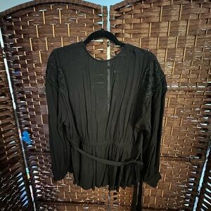 Stylish black wrap top featuring elegant lace details. Torrid size 2 or XL/XXL