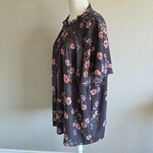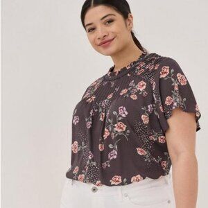 Plus size chiffon floral blouse from TORRID - short flutter sleeves - small ruffles at neck - lace trim at neck and shoulders - pleated around front and back neck and shoulders