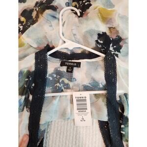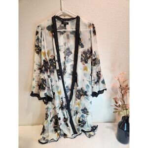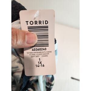 Torrid Textured Chiffon Midi Ruffle Kimono in Floral Cloud Dancer, size 1X (14-16). This lightweight, flowy layering piece features a gorgeous watercolor floral print, black lace trim, and ruffled edges for a boho-chic touch. The open-front design makes it versatile for casual or dressy looks. New with tags (NWT). Perfect for layering over a dress, tank, or as a swimwear cover-up. Let me know if you have any questions!
