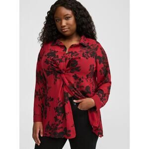 Torrid Chiffon Twist Front Tunic Blouse Red Floral Button Up Long Sleeve Sz 3