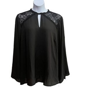 Torrid Chiffon Keyhole Neck Lace Shoulder Size 4 Top. Size 4 Torrid = 4X or 24/26. Flare sleeves. Super sexy lightweight sheer top. Two button closure at back of neck. Includes extra button. New, unworn condition. Approximate measurements: Bust 28” Length 30”