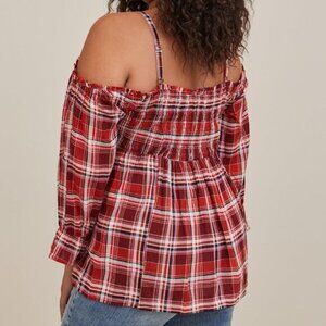 Torrid Cold Shoulder Babydoll Top Crinkle Gauze Smocked Size 3 Red Plaid Fall
