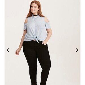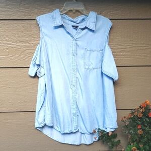 An Americana classic - the denim shirt - gets a feminine refresh. Designed with tencel - a silkier alternative than denim and a lighter weight too - this button down breast pocket style goes against the red, white and blue grain with cold shoulder cutouts.