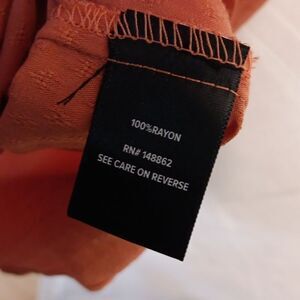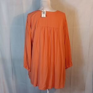 Stylish New with tags coral colored long sleeve blouse. Size 3X (22-24) with a pit to pit measuring 28" and a length of 32". Features a tie neck. Perfect for casual wear.