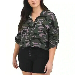 Torrid Cozy Camo Women 1X Drop Shoulder Button Up Top Green Purple Roll Tab