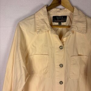 This Torrid cream utility jacket is crafted from a lightweight cotton fabric, making it an ideal choice for a casual outer layer. Its relaxed fit and collared neckline offer a comfortable yet stylish look. Cargo pockets!