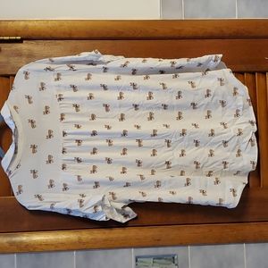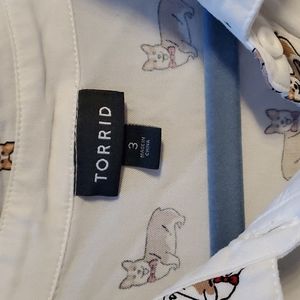Stylish Torrid shirt with dog pattern. Features short sleeves and a classic collar.
