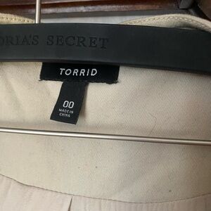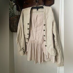 Chic cream blazer with ruffle accents. Features button details. Ideal for a polished look.