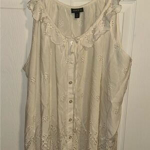 This elegant cream blouse from Torrid features a sleeveless design with a charming ruffled bib collar and a stylish tie front. The flowing silhouette and delicate detailing make it a perfect choice for both casual and semi-dressy occasions.