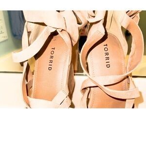 These Torrid sandals feature a chic strappy design in a soft cream color, perfect for warm weather. The intricate woven pattern and open-toe style offer a minimalist yet sophisticated look. Ideal for versatile styling, these sandals are a must-have for any wardrobe.