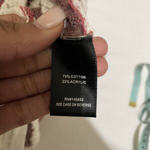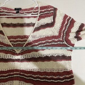 This beautiful crochet sweater is perfect for any boho-chic outfit. The V-neckline adds a touch of elegance, while the 3/4 sleeves keep you cool and comfortable. The striped pattern and beige, mauve, and brown colors give it a unique and eye-catching look.