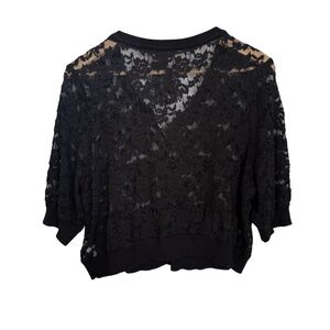 Black lace cropped shrug/cardigan with button-front closure. Perfect for layering over dresses, tanks, or formal outfits.
