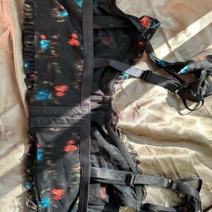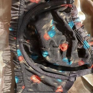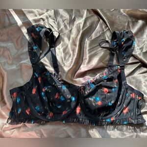 Black mesh bra with a double ruffled strap. Longline black bra with random blurry red and blue spots throughout. Cute ruffle around the bottom of the entire bra. EUC no flaws. It is a Torrid size 2 but measures a 36 without stretching on the loosest hook. Smoke free pet friendly home.
