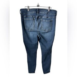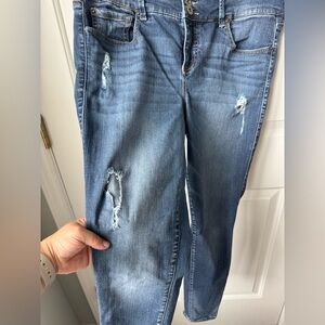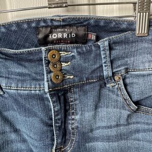 Dark blue denim jeans by Torrid. Features triple button closure and classic stitching. These are distressed jeans. A fitted style. Regular length. Skinny Jean.