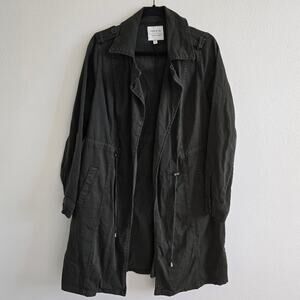 Stylish Torrid dark green utility-style long jacket with button-tab sleeves, adjustable drawstring waist, and front pockets. Made from a cotton-rayon-spandex blend for a comfortable fit with just a bit of stretch. Features button details on the shoulders and a draped open front for a flattering silhouette. Torrid size 00 (equivalent to women’s M/L). In good gently used condition with no flaws noted.