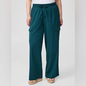 Torrid pants, wide leg cargo, teal trousers, plus size pants, stretch challis, drawstring waist, utility pants, relaxed fit, soft rayon, comfy chic