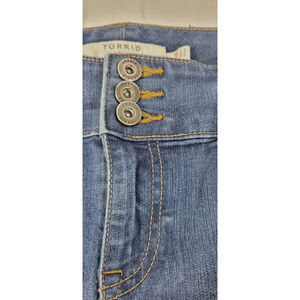 Torrid Denim 16R Jegging First At Fit Medium Wash 3 Button Skinny Leg Jeans. Very good overall condition. No fraying at the cuffs. No thinning at the thighs. The front pockets are faux, but the back pockets are open. Please look at all pictures and ask any questions before purchase. Please see measurements for fit.