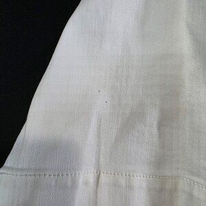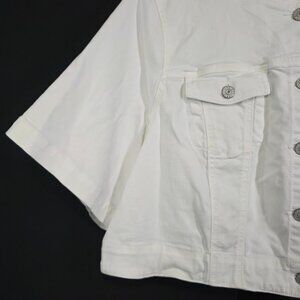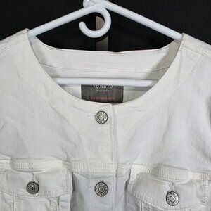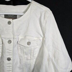 A modern take on the classic denim jacket from the popular plus-size brand Torrid. This version is crafted from a comfortable stretch denim in a crisp white, perfect for warmer weather. The design features a trendy cropped silhouette, a unique collarless neckline, and short sleeves for a chic, minimalist look. With classic chest pockets and branded button hardware, it's an ideal layering piece to wear over sundresses or tank tops. Please note two small, faint spots on the shoulder, as detailed in the photos.